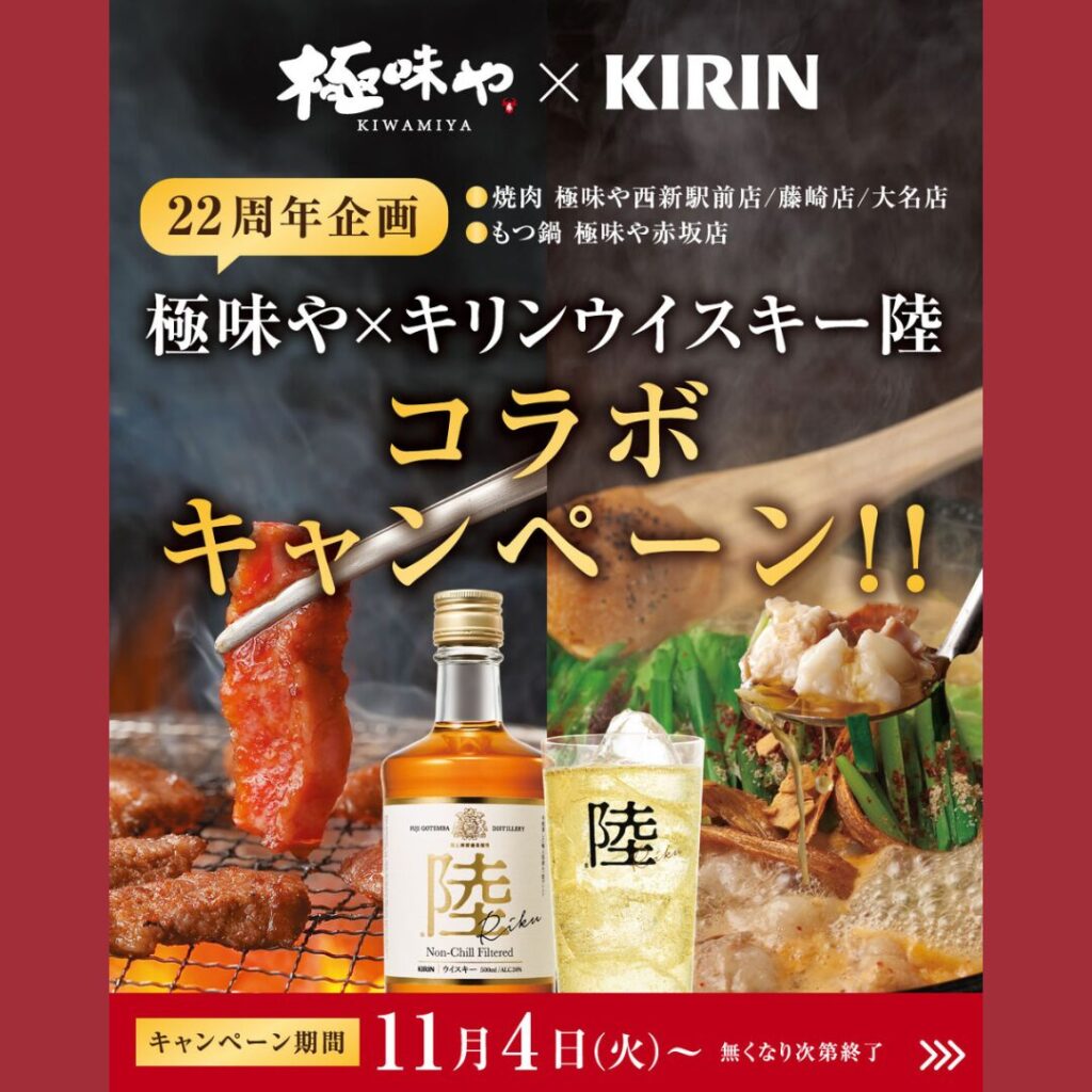 【焼肉・もつ鍋店限定】極味や✖キリンウイスキー『陸』コラボキャンペーン開催🍻