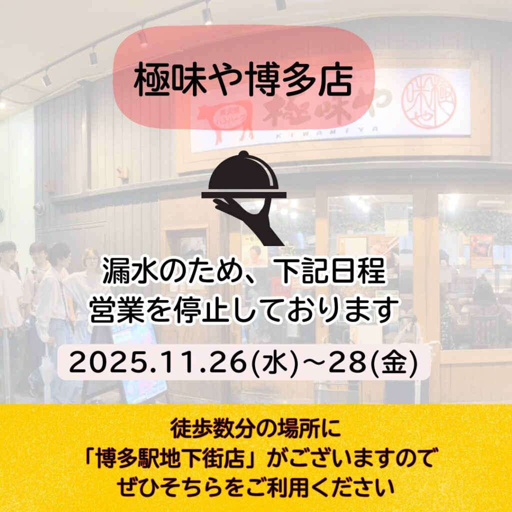 【極味や 八幡店(ジ アウトレット北九州)】より休業のお知らせ👷