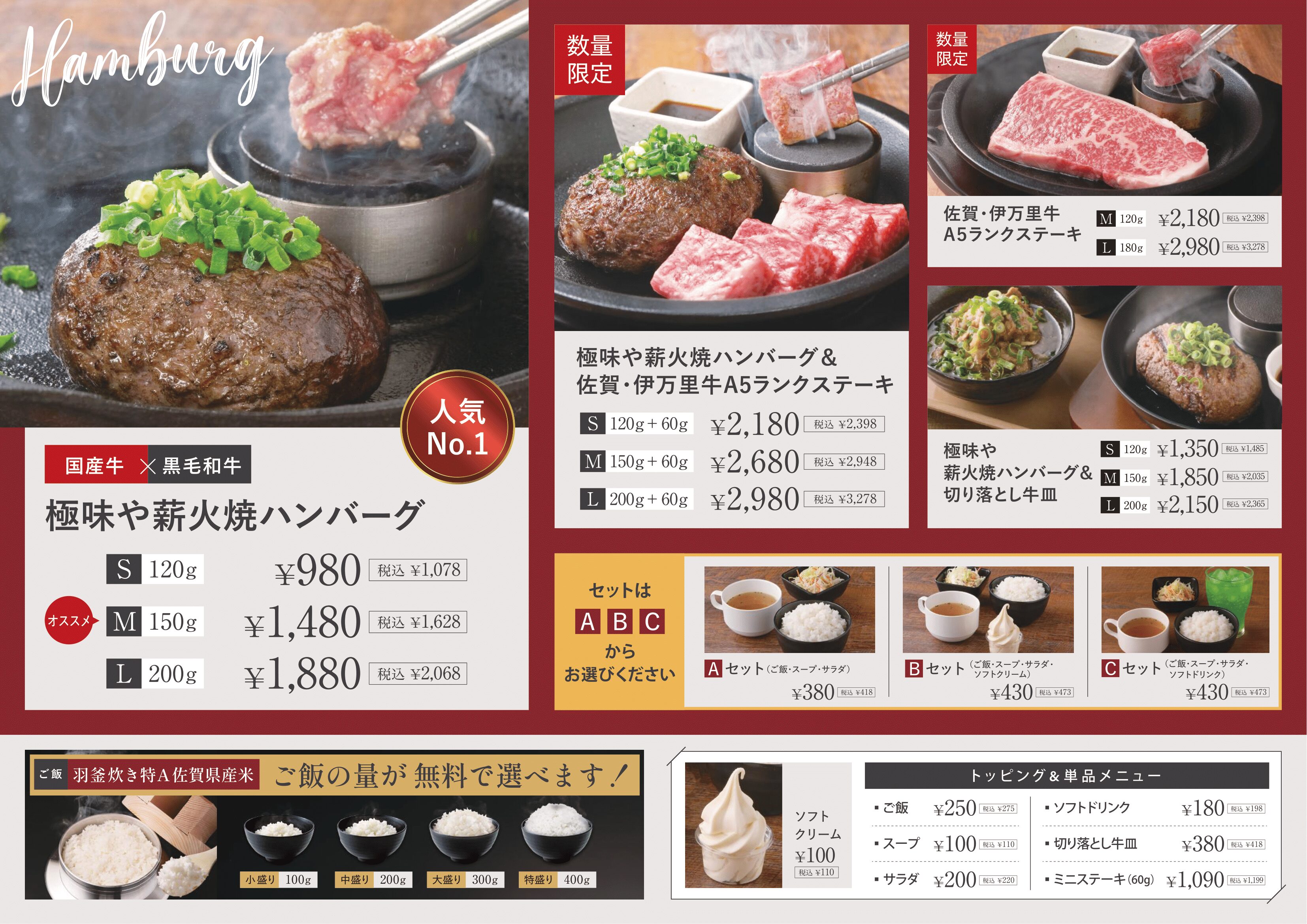 国産の薪火で燻した複雑で香り豊かな極味やハンバーグは八幡店から提供開始。是非お試し下さい。