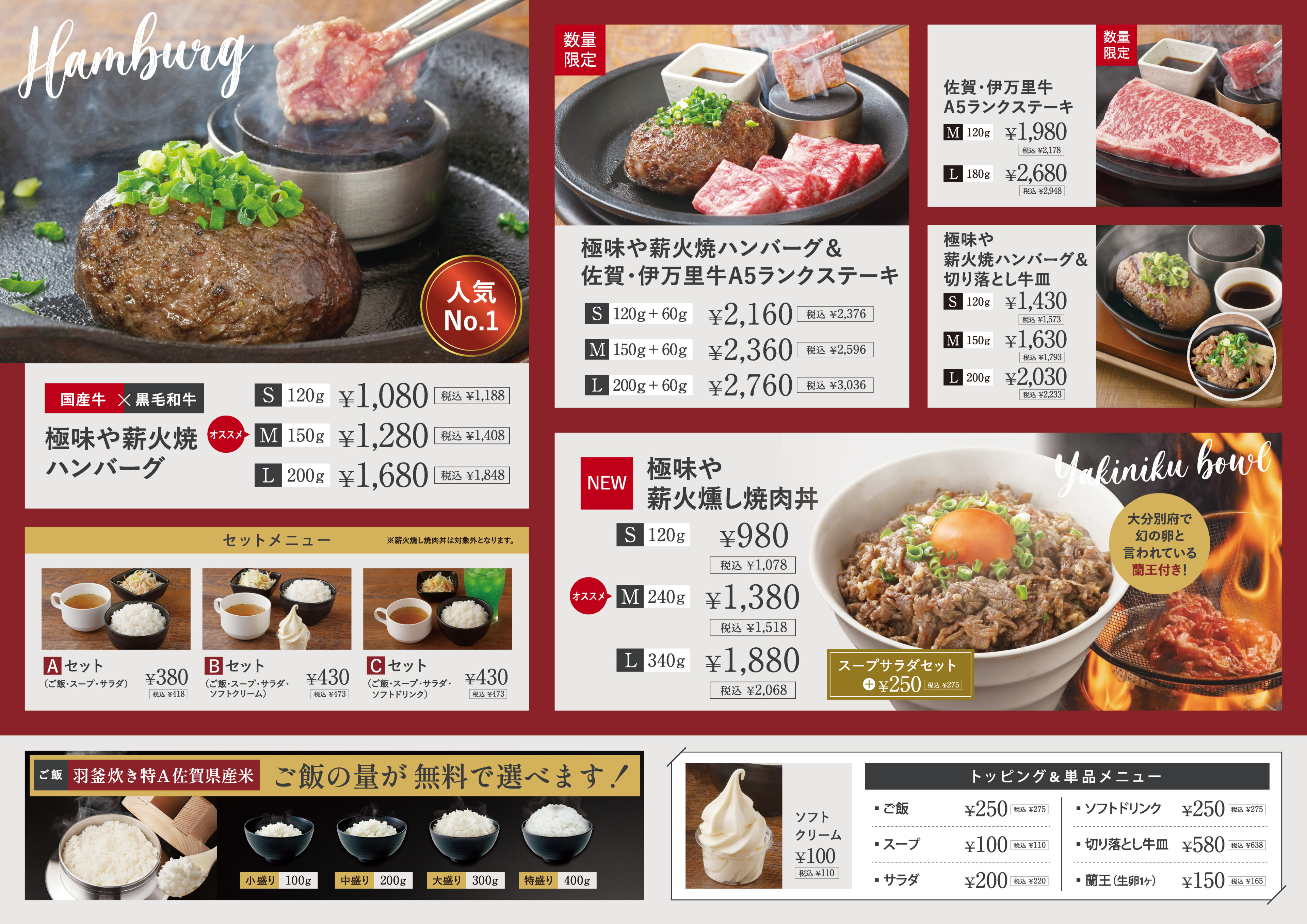 2025年4月オープン。佐賀県初出店、グループとして15店舗目のお店です。ハンバーグは薪火焼き、ご飯は地元佐賀県産米を使用した羽釜ご飯を提供。フードコート内にあるお店なので、お買い物途中にも立ち寄れます。